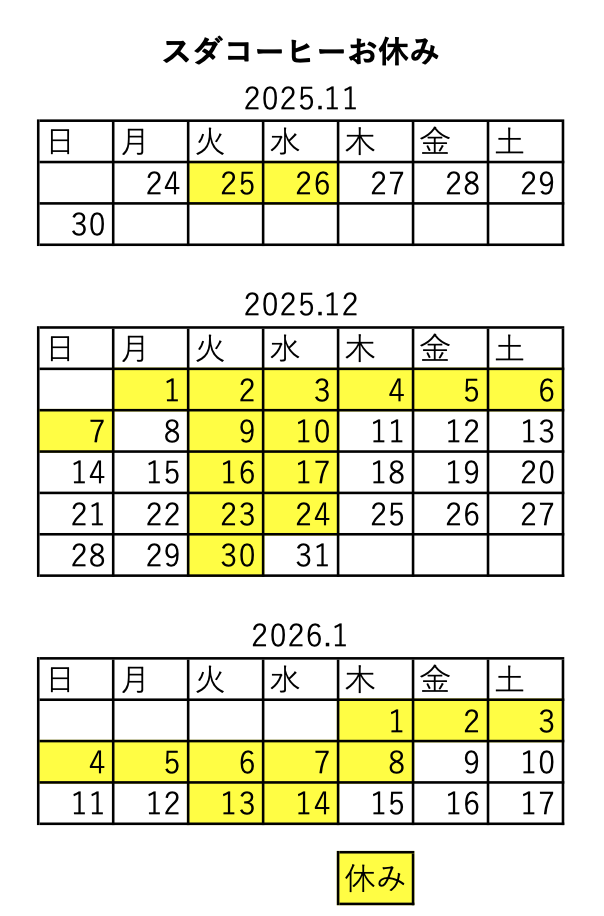 珈琲工房須田お休みカレンダー